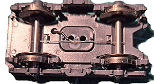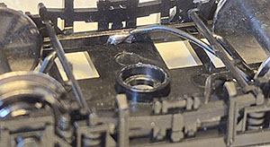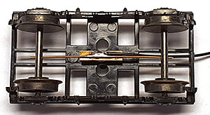 Plastpiggarna har en smal del längst ut som jag klipper bort. Jag tar bort hjulaxlarna under limningen och monterar tillbaka efter att limmet härdat. Trådarna ligger då an mot axlarnas ovansida så hjulen pressas lite mot rälsen i stället för tvärt om. Det fungerar bra och det rullar väldigt lätt.